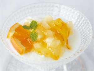 ②ヨーグルトにかけ、オレンジを添える。