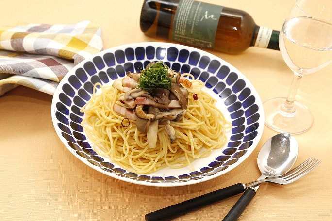 ①ベーコンは、5㎜幅に切っておく。きのこ類は、食べやすい大きさに分けておく。