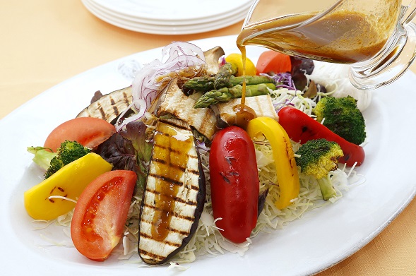 ②.①にオリーブ油を少しずつ加えてドレッシングを作る。